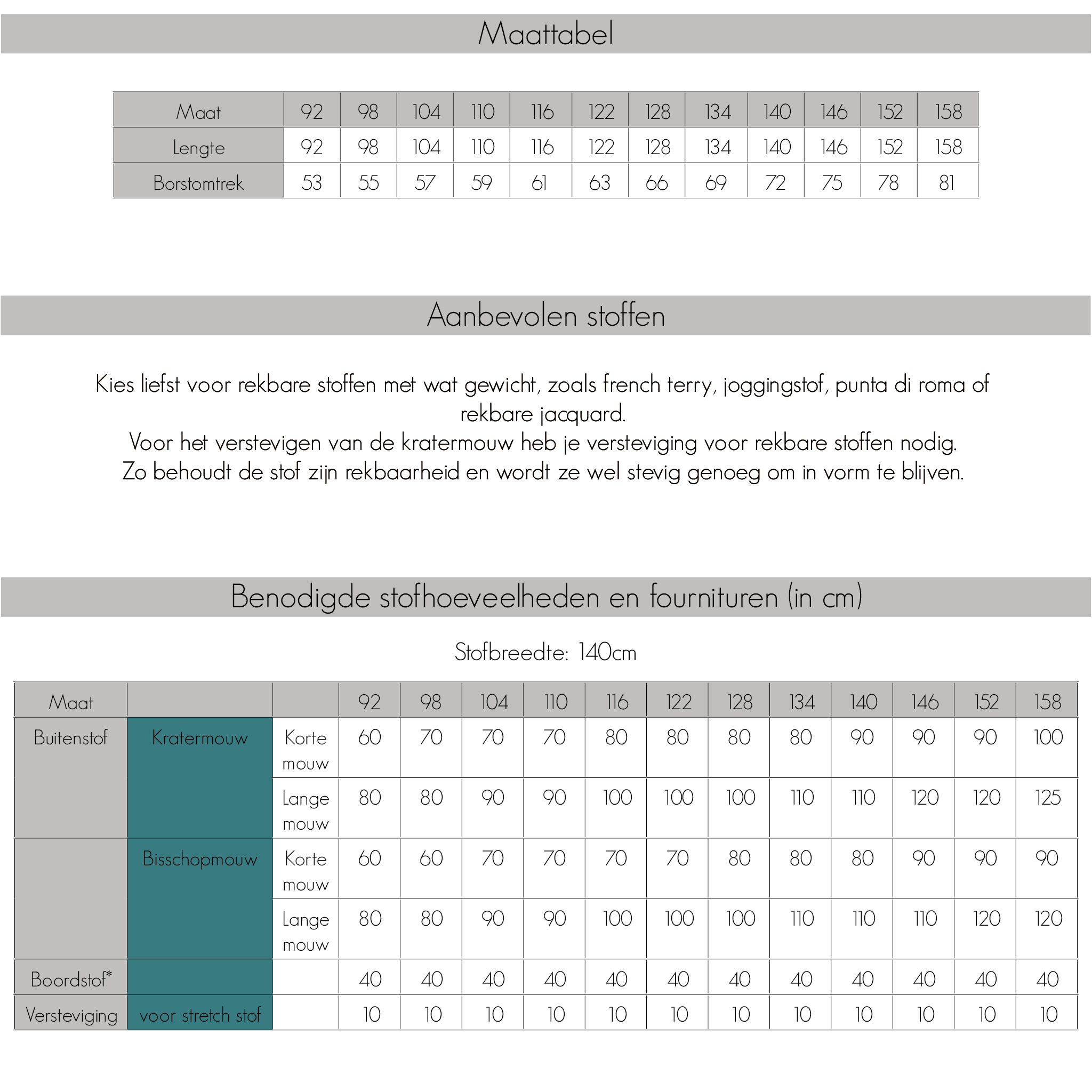 -het patroon afgedrukt op een A0 pagina in de maten 92, 98, 104, 110, 116, 122, 128, 134, 140, 146, 152 & 158