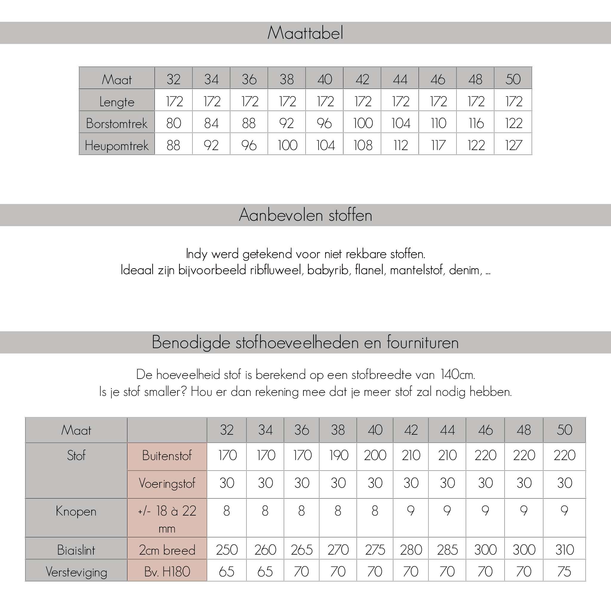 -het patroon afgedrukt op A0 formaat in maten 32, 34, 36, 38, 40, 42, 44, 46, 48 en 50