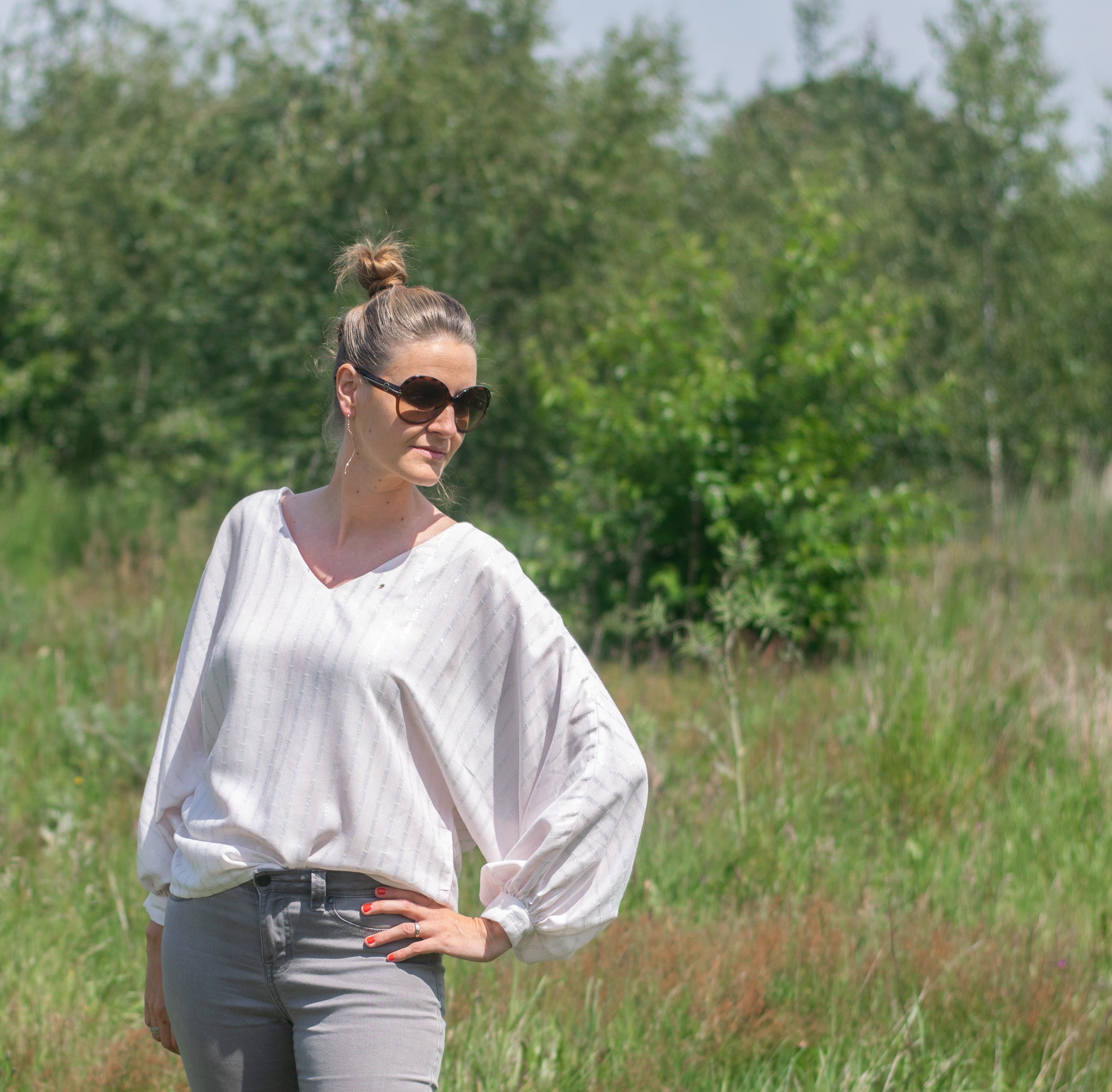 De blouse heeft aangeknipte mouwen waarbij je kan kiezen tussen 3/4 lengte of lange mouwen.