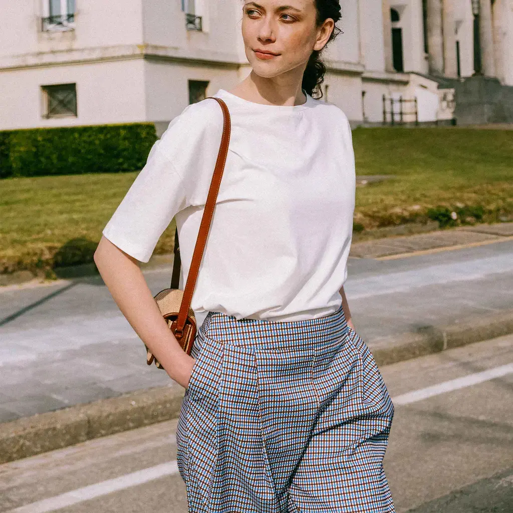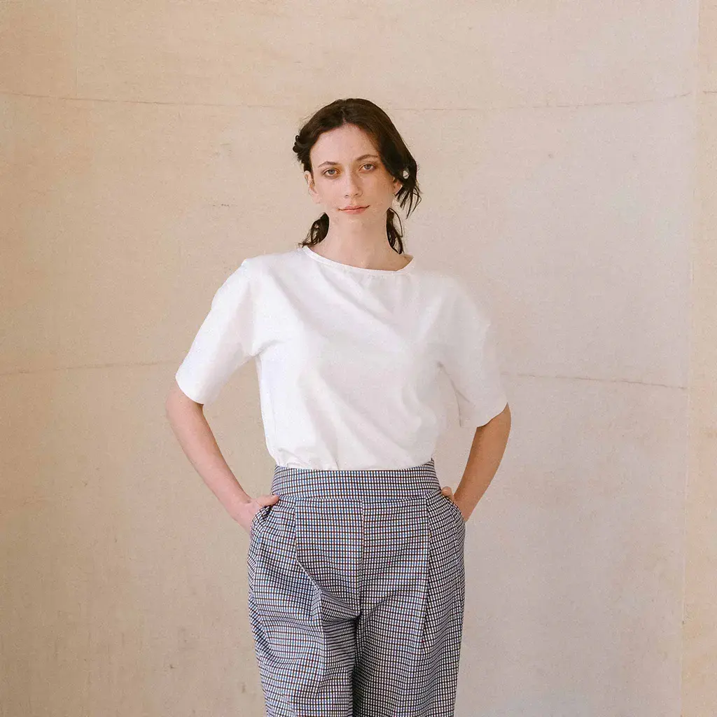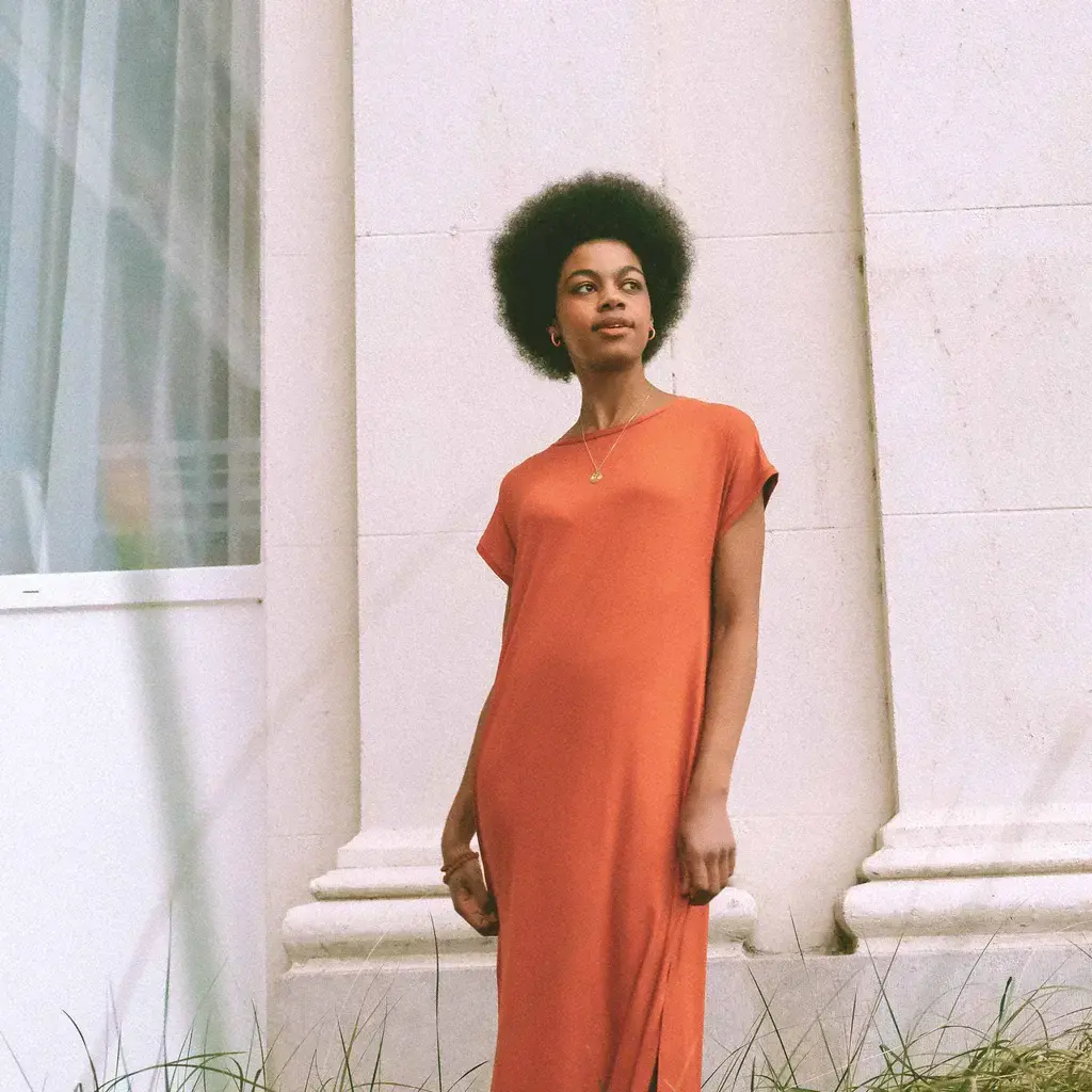 Zowel de top als de jurk zijn super comfy als je ze maakt in een gebreide stof of jersey. In dat geval maak je de halslijn met tricot halsboord. Maar door de wijde pasvorm zijn geweven stoffen ook heel geschikt. Kies voor doorvallende stoffen zoals middelzware viscose-mengelingen, tencel, bamboe, modal of cupro. Voor dikke stugge stoffen is dit model minder geschikt, er moet een zekere vloeibaarheid in de stof zitten.