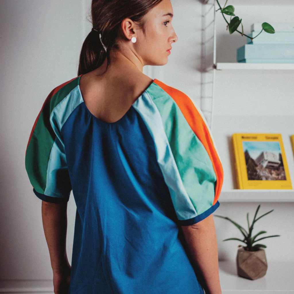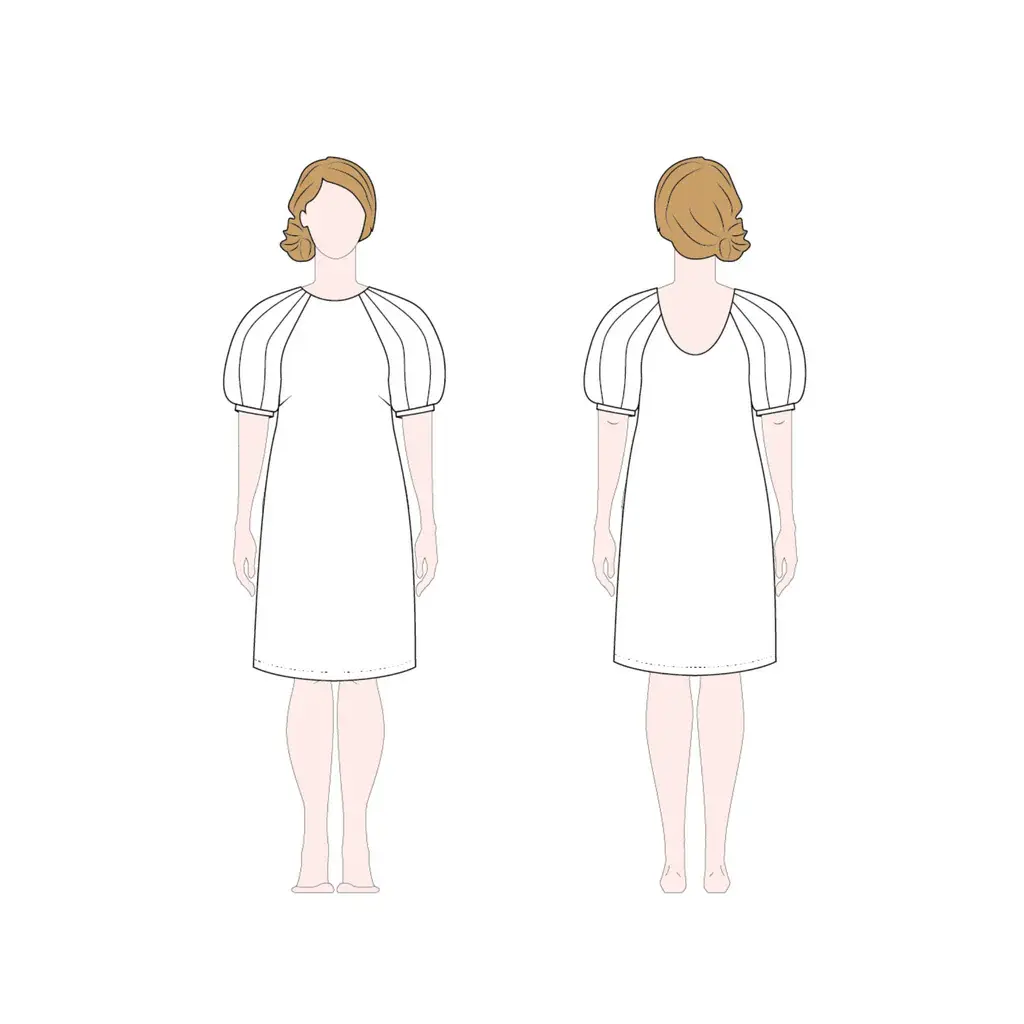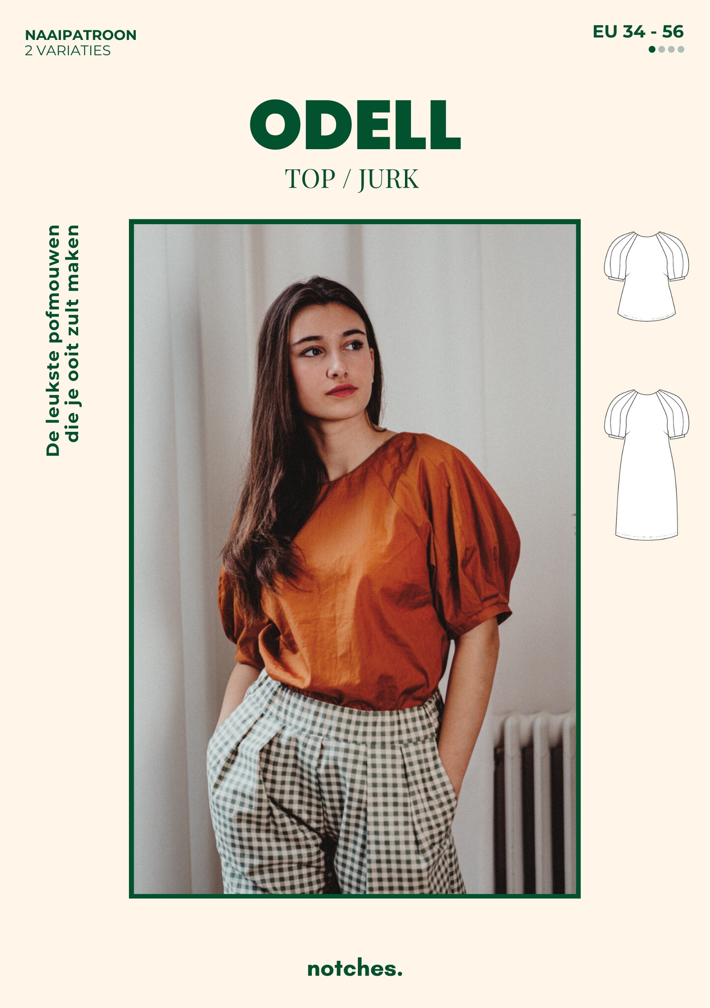 Odell is een speelse maar beginnersvriendelijke top of korte jurk met de gemakkelijkste pofmouwen die je ooit zult naaien—geen rimpels nodig, alleen slim gevormde naden. Met een hoge ronde hals vooraan en een diepe uitsnijding achteraan is ze ontworpen om de show te stelen. Snel te naaien, gemakkelijk te dragen en perfect om stoffen te mixen!