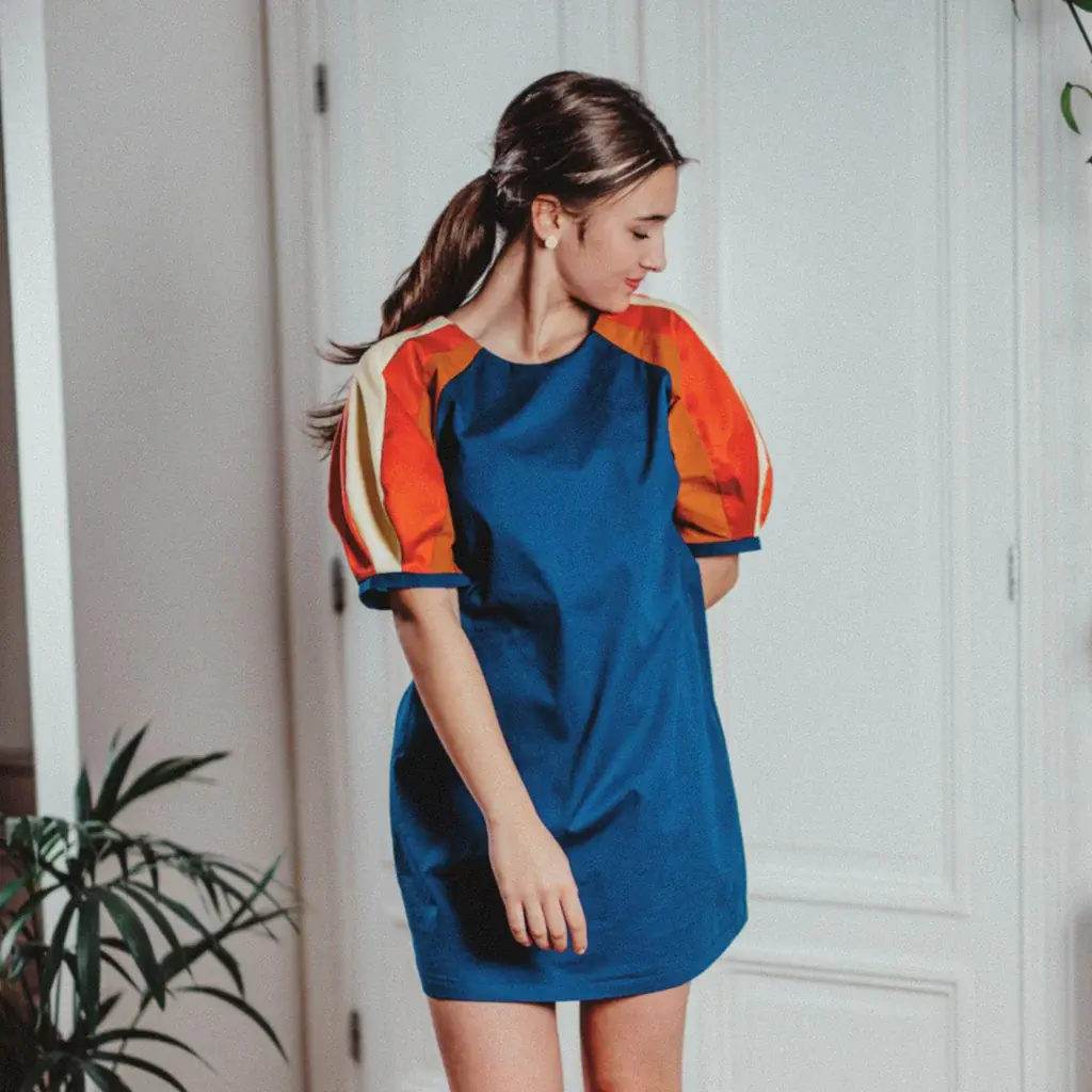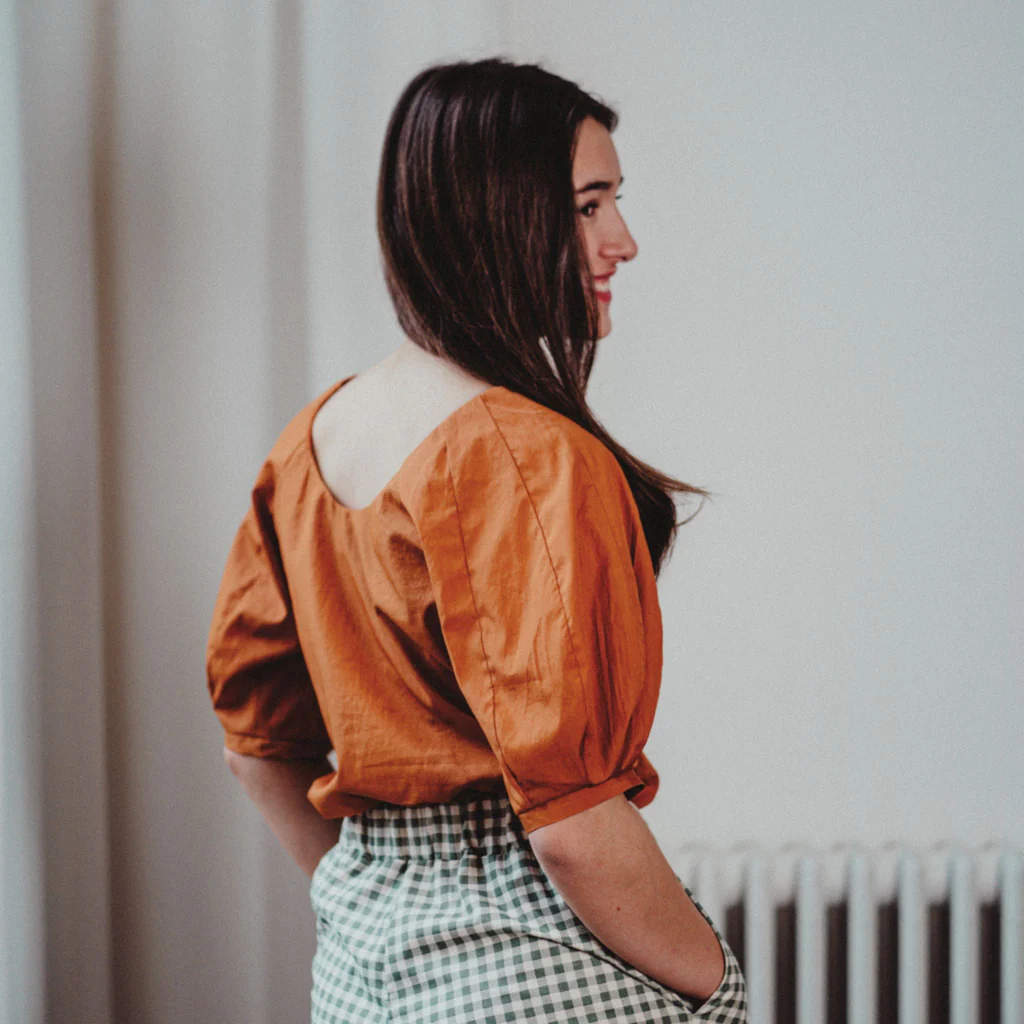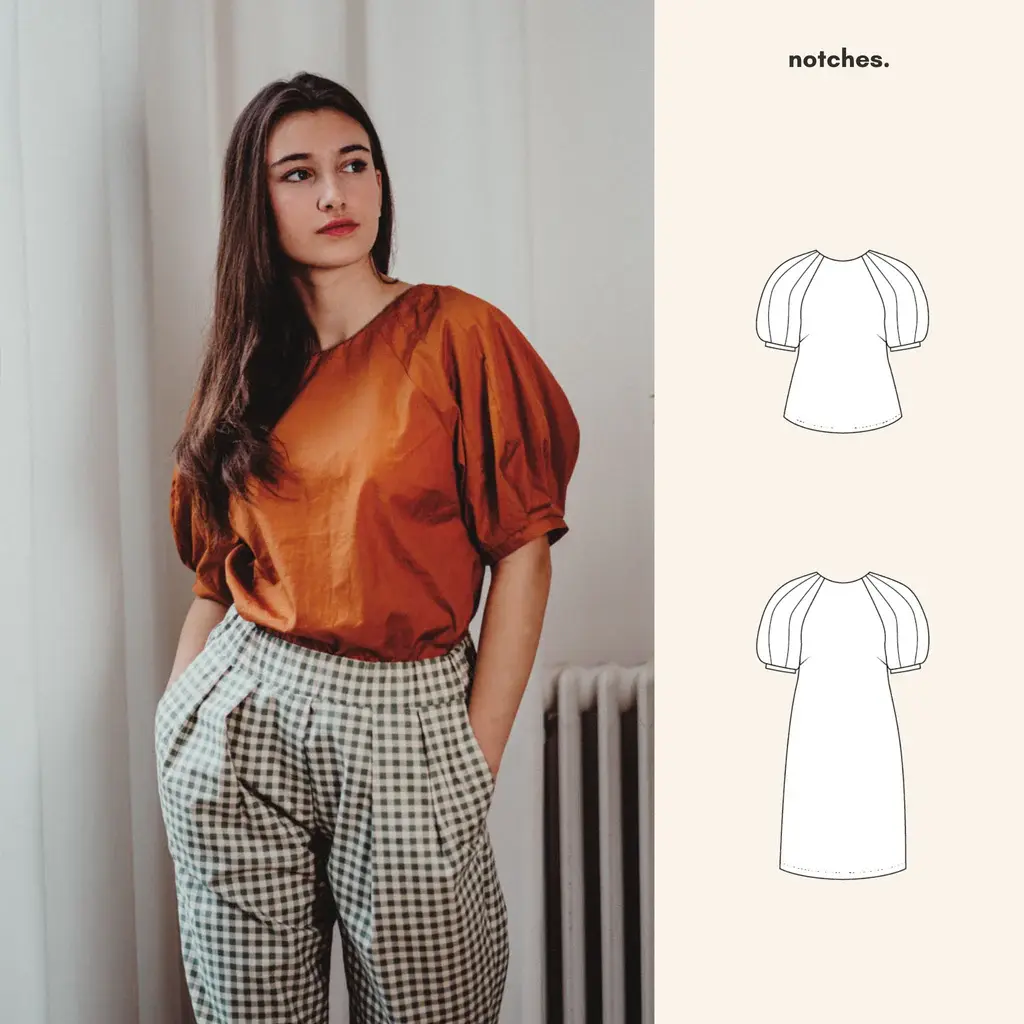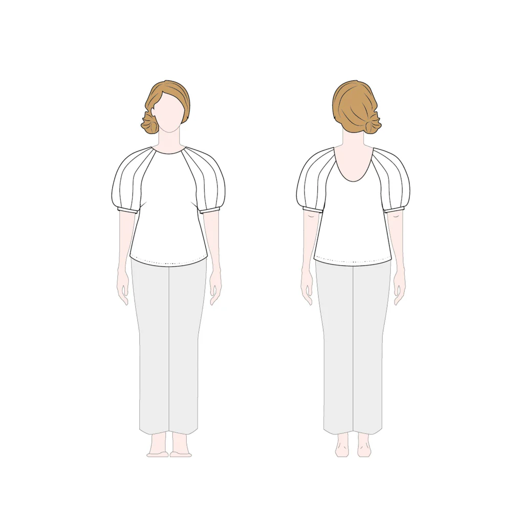 Odell is een speelse maar beginnersvriendelijke top of korte jurk met de gemakkelijkste pofmouwen die je ooit zult naaien—geen rimpels nodig, alleen slim gevormde naden. Met een hoge ronde hals vooraan en een diepe uitsnijding achteraan is ze ontworpen om de show te stelen. Snel te naaien, gemakkelijk te dragen en perfect om stoffen te mixen!