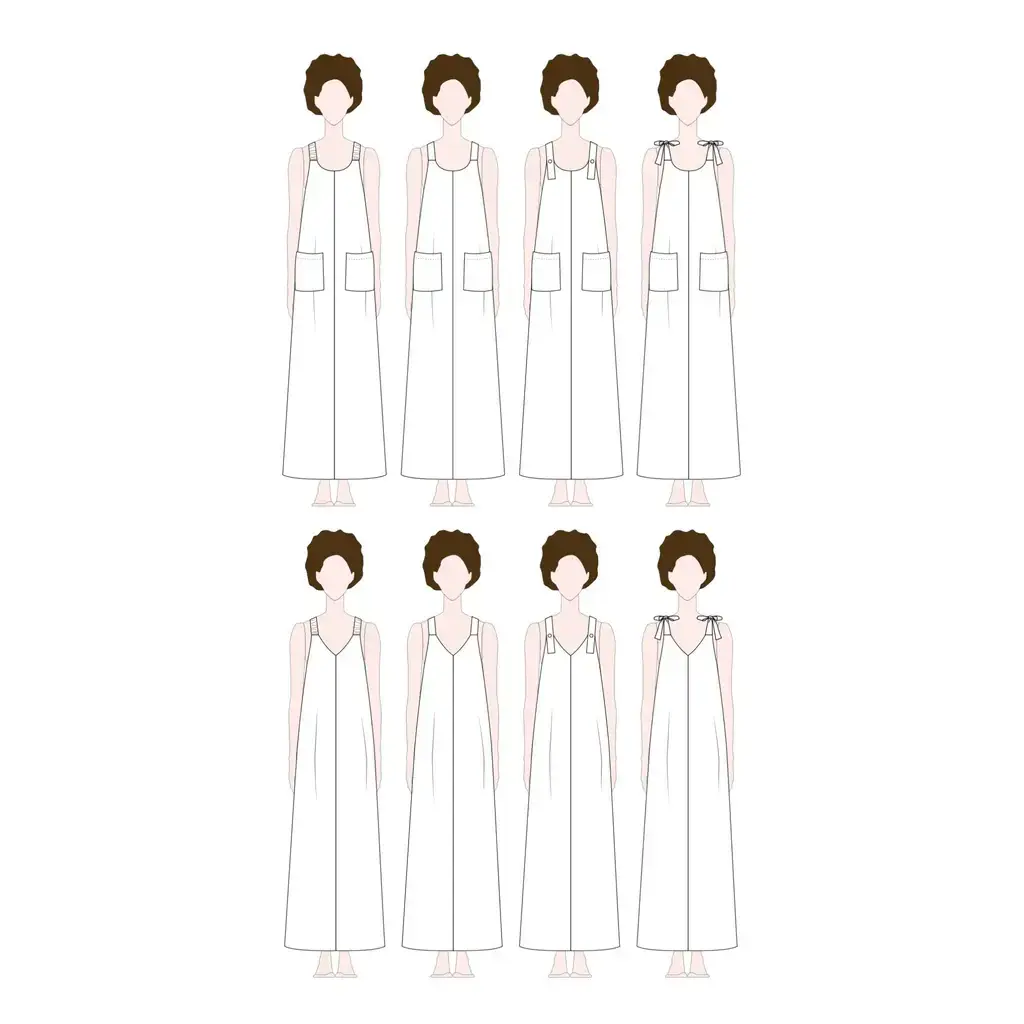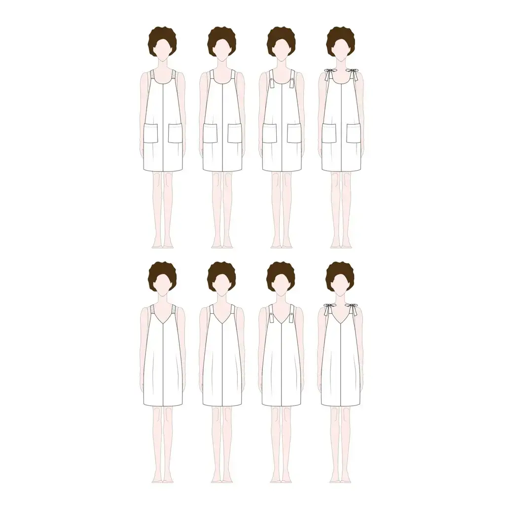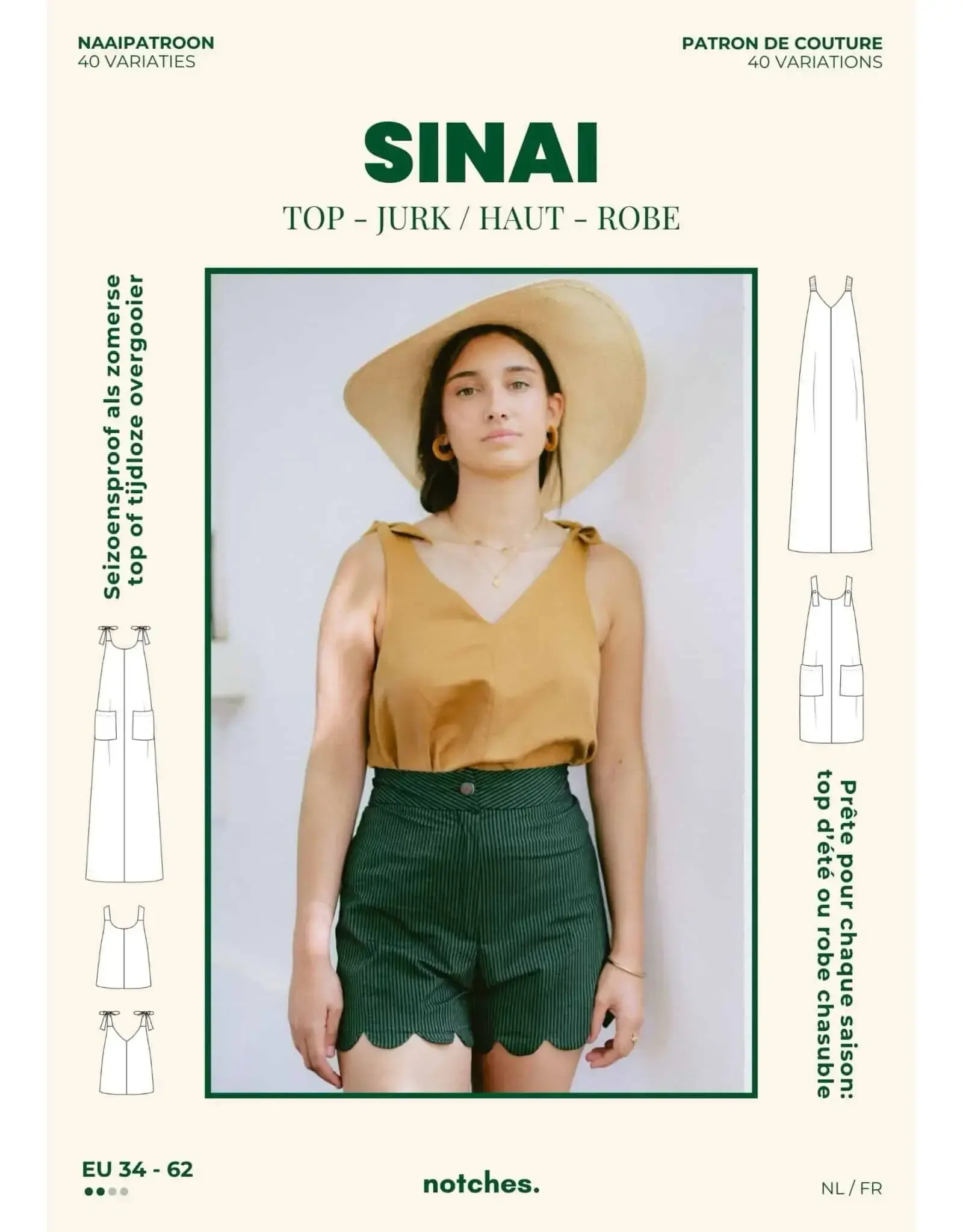 Sinai is een moeiteloos stijlvolle A-lijn jurk of top die je volledig naar je eigen smaak kunt samenstellen. Met verschillende opties — een ronde hals of V-hals, schouderbandjes met striklinten, knopen, elastiek of een cleane afwerking, en drie verschillende lengtes — is Sinai een echt mix-en-match patroon.