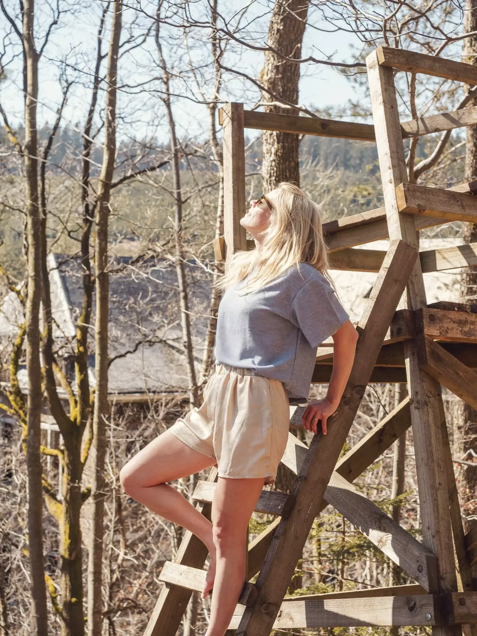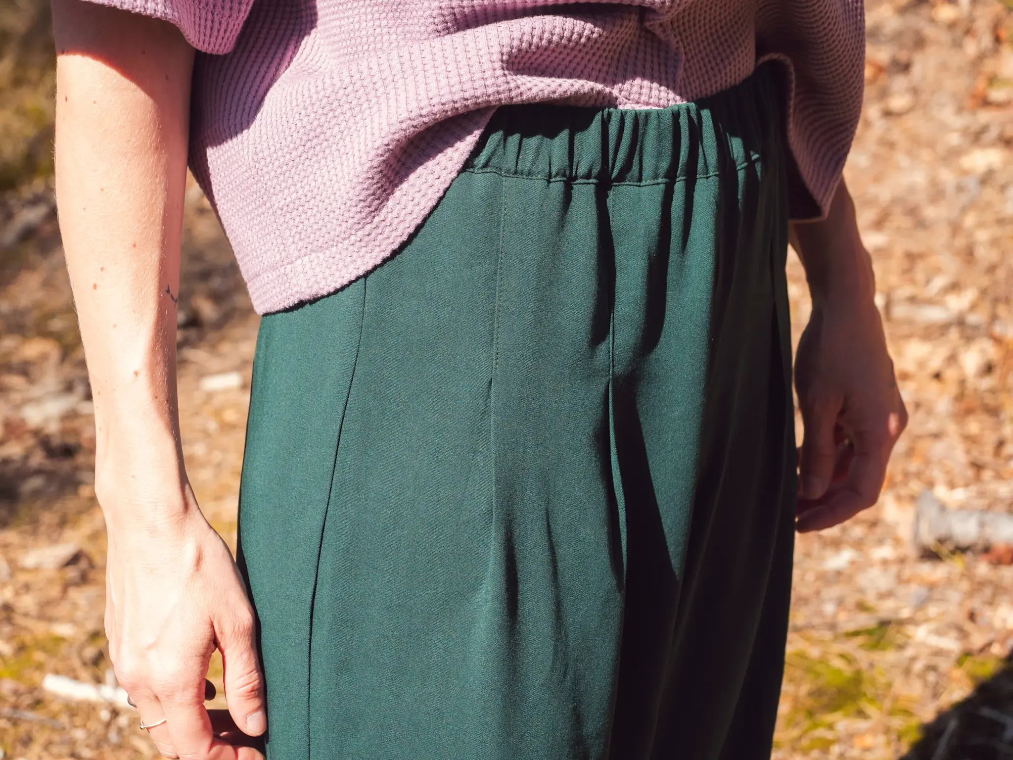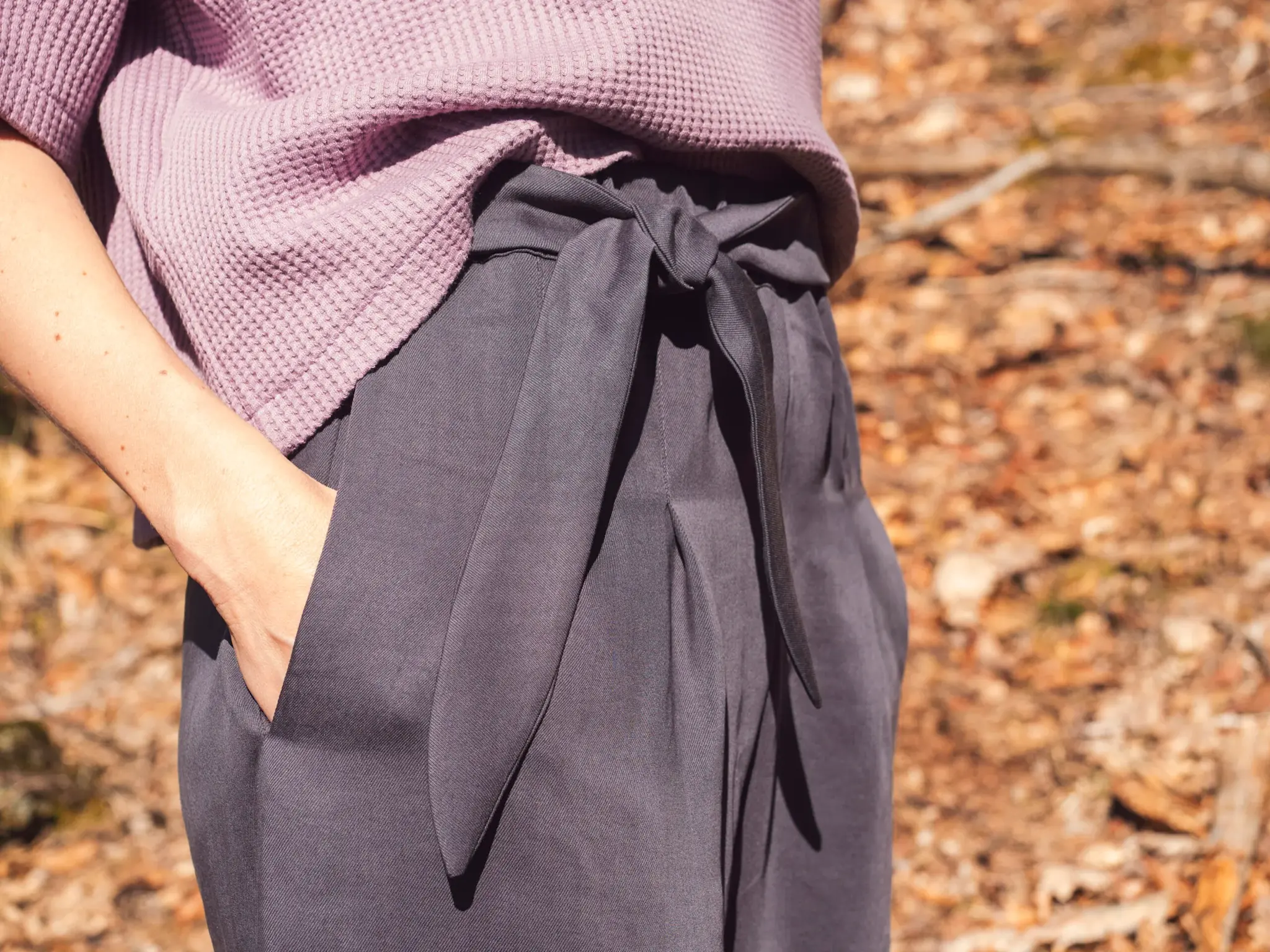 Clara is een wijde broek met plooitjes vooraan, een elastiek in de taille en zakken in de zijnaad. Optioneel kan je linten vastnaaien aan de zijnaad. Ideaal om een buikje te verdoezelen, zo’n knoop vooraan.