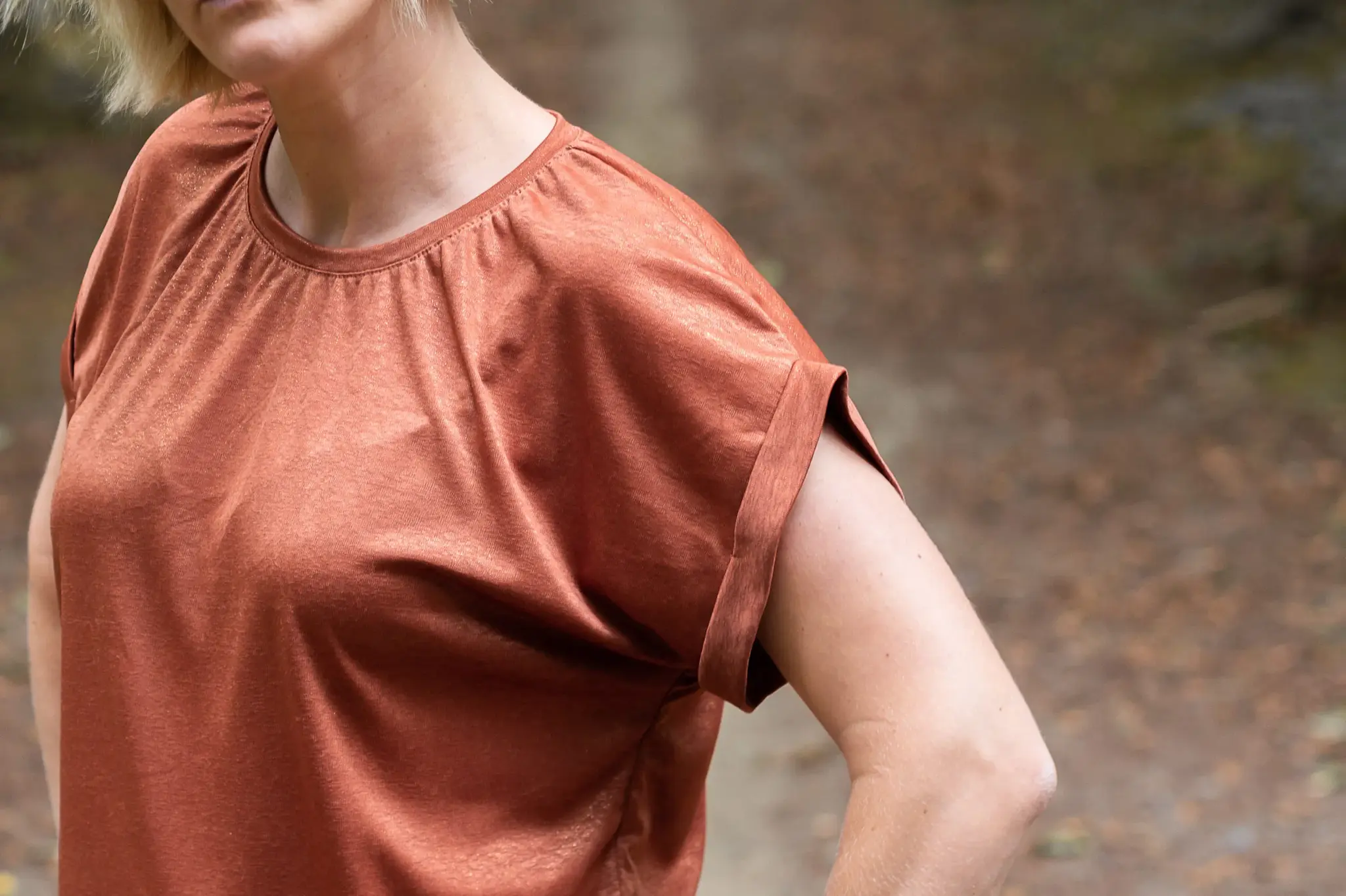 Lena is een jurk of top met dezelfde aangeknipte mouwen als Fons, maar met een bovenstuk en onderstuk. Voor het onderstuk kan je kiezen voor rimpels voor- en/of achteraan of voor een plooi achteraan. Lena matcht ook met zowel rekbare als niet-rekbare stoffen! Kies voor Lena een goed doorvallende stof. De versie met rimpels valt heel breed, dus die moet mooi naar beneden vallen langs het lichaam.
