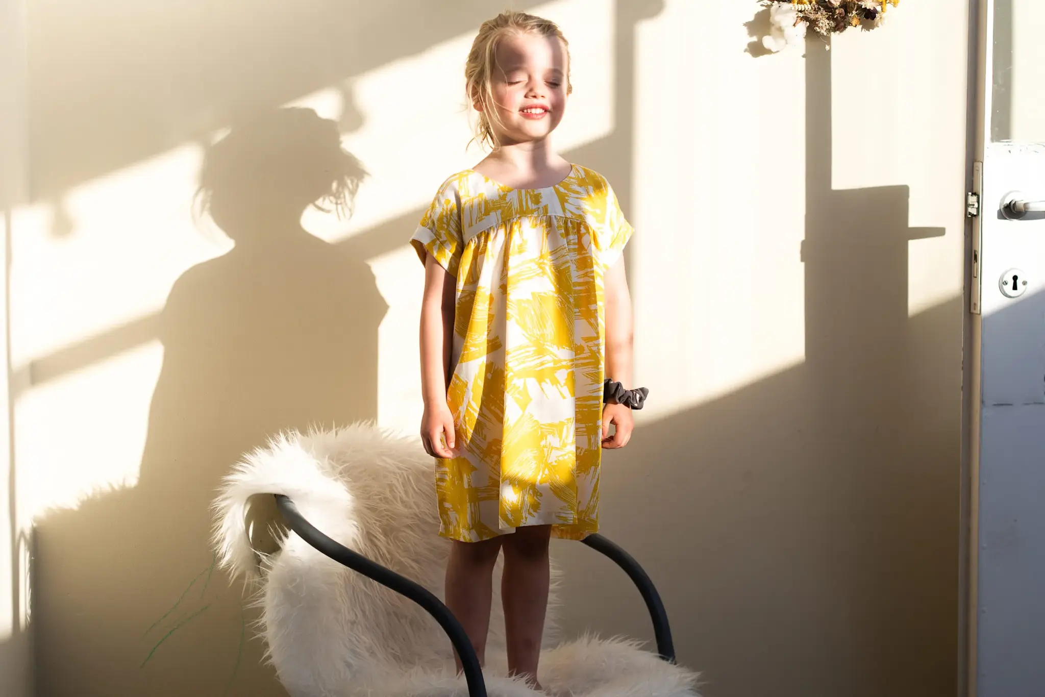 Lena is een jurk of topje met dezelfde aangeknipte mouwen als Fons, maar met een bovenstukje en onderstukje. Voor het onderstukje kan je kiezen voor rimpels voor- en/of achteraan of voor een plooi achteraan. Er is een versie voor rekbare stoffen en eentje voor niet-rekbare stoffen. Dit patroon is de update en uitbreiding van het gratis patroon Lena dat op de blog te vinden is. Kies voor Lena een goed doorvallende stof. De versie met rimpels valt breed, dus moet mooi naar beneden vallen langs het lichaam.