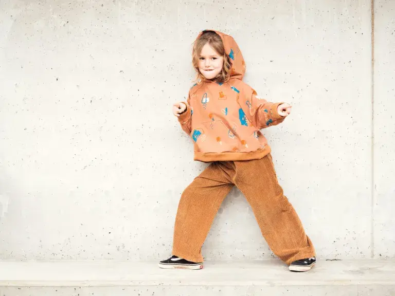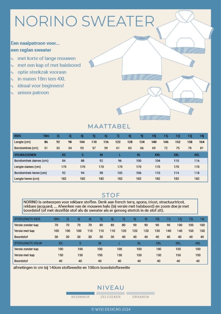 Norino is een oversized raglan sweater patroon met korte, wijde mouwen. De mouwen, hals en zoomboord worden afgewerkt met boordstof. Norino kan ook met kap gemaakt worden en met een steekzak vooraan.